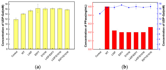 Figure 9. The influence of the addition of Ton1914 and its mutants on the yield of UDP-Gal. (a) The addition of 0.5 mg/mL of Ton1914 and its mutants in the cascade reaction of UDP-Gal synthesis; (b) The addition of 1000 U of Ton1914 and its mutants in the cascade reaction of UDP-Gal synthesis. (All assays were performed in triplicate, and the standard deviations of the biological replicates are represented by error bars).