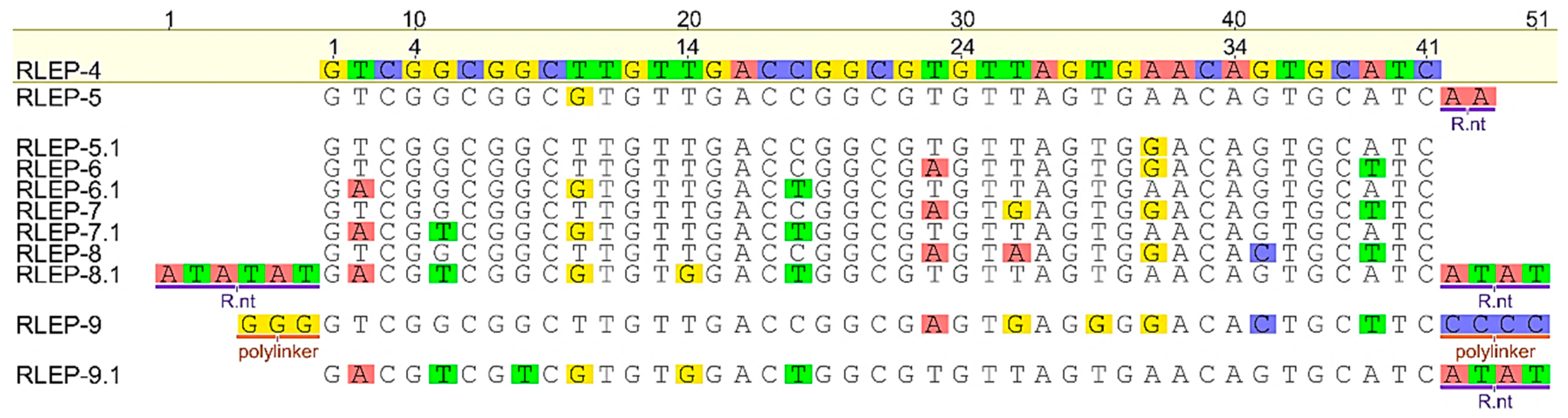 Figure 2. Multiple alignment (Map to Reference) of synthetic truncated ssDNA sequences (M. leprae RLEP-4 to RLEP-9.1) of the hybridization sites of the detection and capture probes by Geneious®. The native reference sequence (RLEP-4) is shown at the top. Colored boxes indicate the positions of the hypothetical introduced SNPs. For each construct containing SNPs in the detection region, a corresponding mirrored construct was designed with the same number and position of SNPs in the capture probe region. Guanine (yellow) or cytosine (blue) polylinker and random nucleotides (R.nt) were added to decrease the influence of thermodynamic parameters.