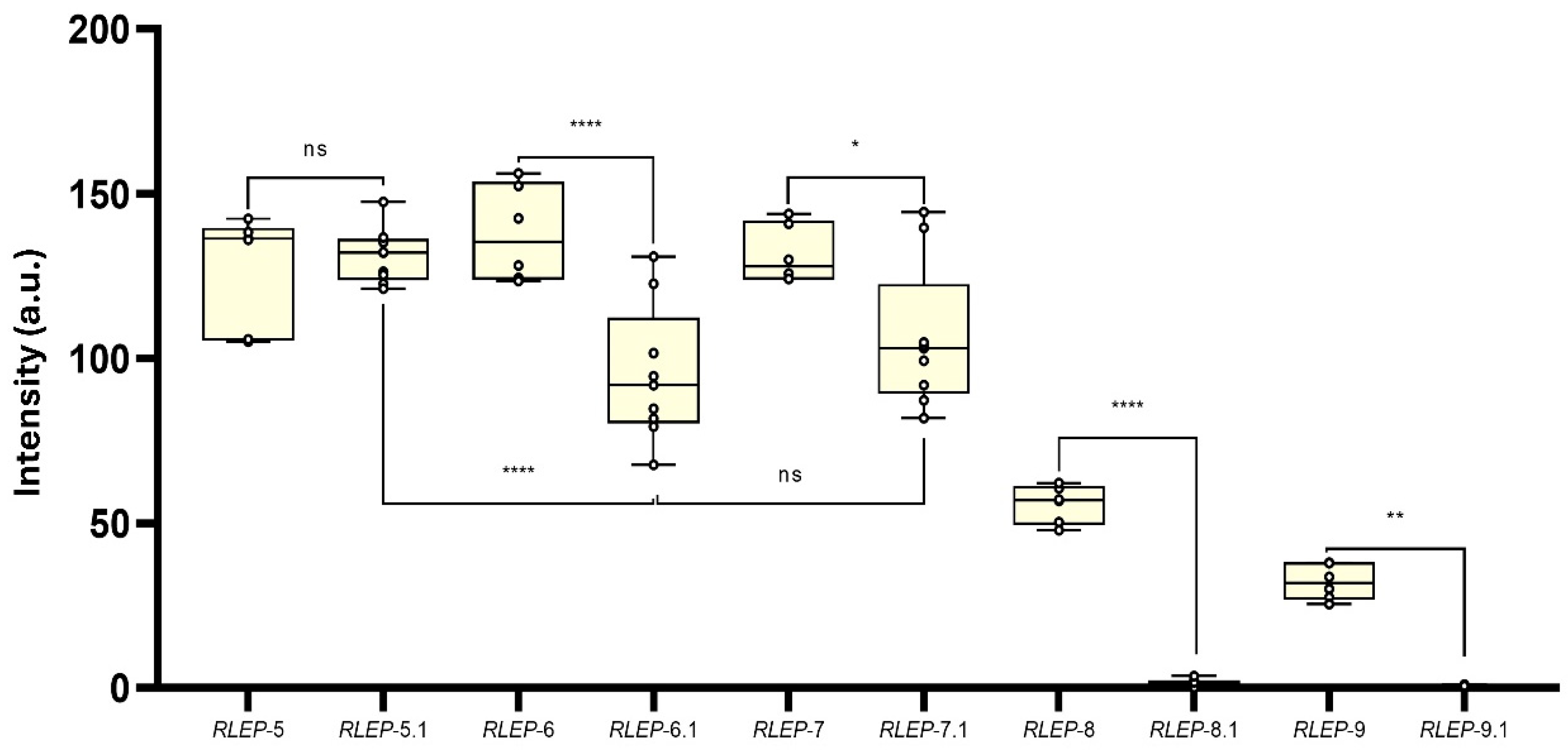 Despite the absence of T-line signal for the native M. leprae RLEP ssDNA (mean: 1.27 ± 0.80 a.u.), all three synthetic ssDNAs generated visually detectable T-line intensities in the AF-NALFA (Figure 5b and Supplementary Figure S3b). RLEP-1, which maintained intact detection and capture hybridization regions, produced the highest average T-line intensity (136.7 ± 8.8 a.u.), followed closely by RLEP-2 (131.1 ± 8.3 a.u.), which included a hypothetical SNP (A→G) in the capture probe region. No significant difference was observed between these two constructs (ns). In contrast, RLEP-3, carrying three hypothetical SNPs, including one in the detection probe region and two in the capture probe region, showed a significant reduction in T-line signal (114.7 ± 9.5 a.u.), differing from both RLEP-1 (**** p < 0.0001) and RLEP-2 (*** p < 0.001). The blank control remained negative (mean: 0.53 ± 0.85 a.u.)