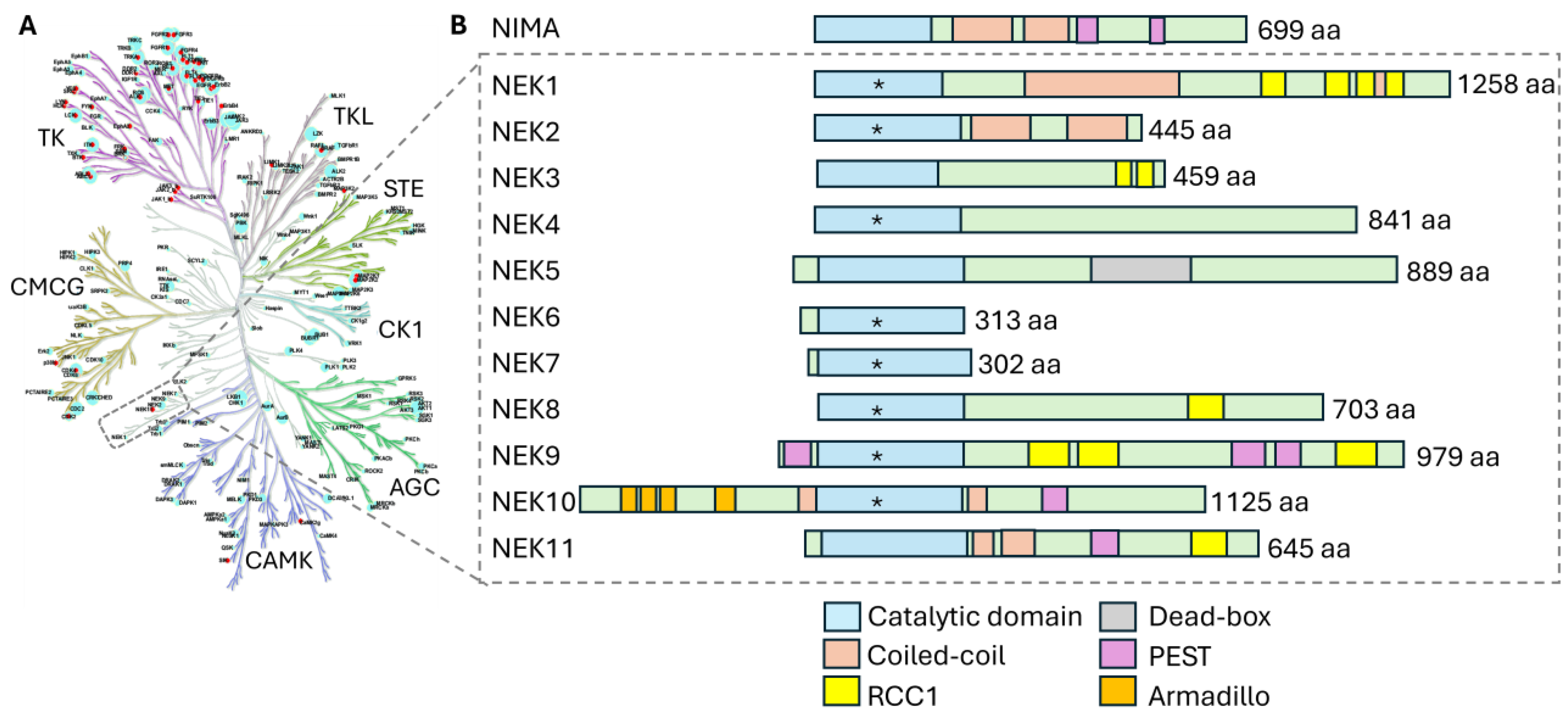 | Coiled-coil domain | All human NEKs except NEK4, 6, 7; NIMA | C-terminal tail or flanking kinase domain | Drives homo- or hetero-oligomerization; enables trans-autophosphorylation (e.g., NEK2 dimerization); governs subcellular targeting (e.g., centrosome, nucleolus) |