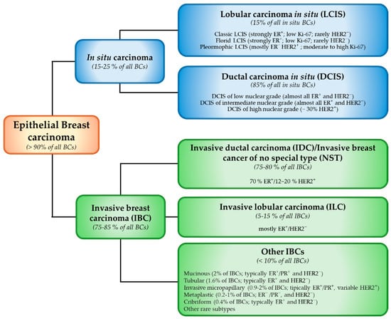 Although BC classification is constantly adapting and evolving, based on the integration of new information from various sources, the standard for diagnosis has been established by World Health Organization (WHO). The primary histologic classification of BC is based on whether the tumor is of epithelial origin, or not. While less than 1% of BCs have non-epithelial origin (e.g., sarcoma deriving myofibroblasts and blood vessel cells), the vast majority of BCs are carcinomas deriving from the epithelial cells of breast lobules and milk ducts [4,5] (Figure 1). This latter group is histologically categorized as in situ carcinoma (further distinguished in lobular and ductal carcinoma, LCIS and DCIS, respectively) and invasive carcinoma (IBC), able to infiltrate the surrounding mammary glandular tissue and metastasize to regional lymph nodes and distant organs. The most common IBC is the invasive carcinoma no special type (NST) [also referred to invasive ductal carcinoma (IDC)], followed by invasive lobular carcinoma (ILC, approximately 10–15% of invasive BC), and other subtypes accounting for less than 10% of BC [4].