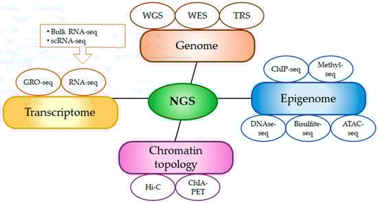 More recent NGS applications include those employed in epigenomics and chromosome conformation and interaction technologies. The first one commonly utilizes chromatin immunoprecipitation followed by sequencing (ChIP-seq) for mapping histone modifications [24], methyl-seq and bisulfite-seq (these techniques enzymatically or chemically convert unmethylated cytosines into uracil, later read as thymidine) for DNA methylation studies [25], ATAC-seq (a technique that creates tagged DNA fragments, using a hyperactive mutant Tn5 transposase, subsequently PCR-amplified and sequenced) and DNase-seq (it consists in sequencing of DNase I-sensitive DNA regions not occupied by histones) for studying chromatin accessibility [26]. Investigations on dynamic and regulated interplay of macromolecules within the cell utilize High-throughput Chromosome Conformation Capture (Hi-C) and Chromatin Interaction Analysis with Paired-End-Tag sequencing (ChIA-PET), the last combining ChIP and sequencing for mapping long-range chromatin interactions [27,28].