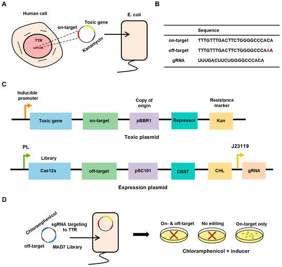 The expression plasmid harbors a MAD7 mutant library, a guide RNA (gRNA) targeting the human TTR locus (sequences: UUUGACUUCUGGGGCCCACA), and a chloramphenicol resistance marker. Expression of MAD7 is regulated by the CI857 repressor under the PL promoter, enabling tight control over their production and the gRNA is expressed from the strong constitutive promoter J23119, ensuring sufficient guide RNA levels to support efficient cleavage. For all strains carrying the expression plasmid, unless a specific incubation temperature was indicated (e.g., 42 °C induction), the cultures were maintained at 30 °C to ensure that cI857 effectively repressed Cas12a expression. An off-target site (TTTGTTTGACTTCTGGGGCCCAAA) differing by a single nucleotide at position 19 from the 5′ end (second-to-last base), corresponding to a distal mismatch. The toxic plasmid carries a toxic gene, along with an on-target site (TTTGTTTGACTTCTGGGGCCCACA) matching TTR (Figure 1B). Expression of the toxic gene is likewise controlled by a tightly regulated, inducible promoter (Figure 1C).