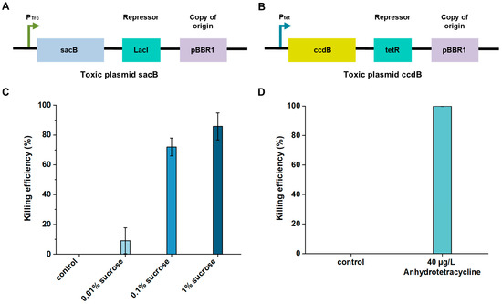 Figure 2. Killing efficiency of toxic plasmids based on different toxic genes. (A) Schematic of the toxic plasmid utilizing sacB as the toxic gene. (B) Schematic of the toxic plasmid utilizing ccdB as the toxic gene. (C) Killing efficiency of SacB-based toxic plasmid under different sucrose concentrations. (D) Killing efficiency of CcdB-based toxic plasmid under anhydrotetracycline induction. n = 3 for each experiment. Error bars represent mean values ± SD.