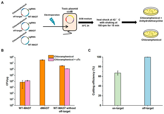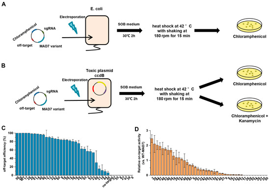 For the off-target assay, plasmids encoding all selected MAD7 variants were extracted. Expression plasmids carrying WT-MAD7 (wild type-MAD7) and WT-MAD7 lacking the off-target site were included as controls. For each electroporation, 100 ng of plasmid was introduced into E. coli electrocompetent cells. After electroporation, cells were incubated at 30 °C and 200 rpm for 2 h, followed by incubation at 42 °C and 180 rpm for an additional 15 min to induce MAD7 expression. Cultures were plated on LB agar containing 34 μg/mL chloramphenicol and 40 µg/L anhydrotetracycline for overnight incubation, and CFU were counted. The off-target cleavage efficiency was calculated using the following equation: