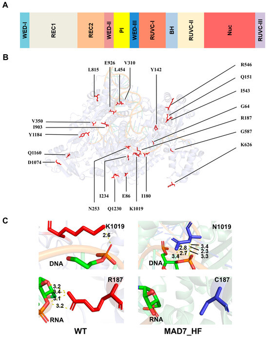 Figure 5. Structural Analysis of MAD7_HF. (A) Domain organization of MAD7. (B) Ternary complex structure of MAD7–gRNA–DNA and spatial distribution of all beneficial mutations on WT-MAD7. (C) Interactions between MAD7-HF mutation sites and DNA/RNA before and after mutation.
