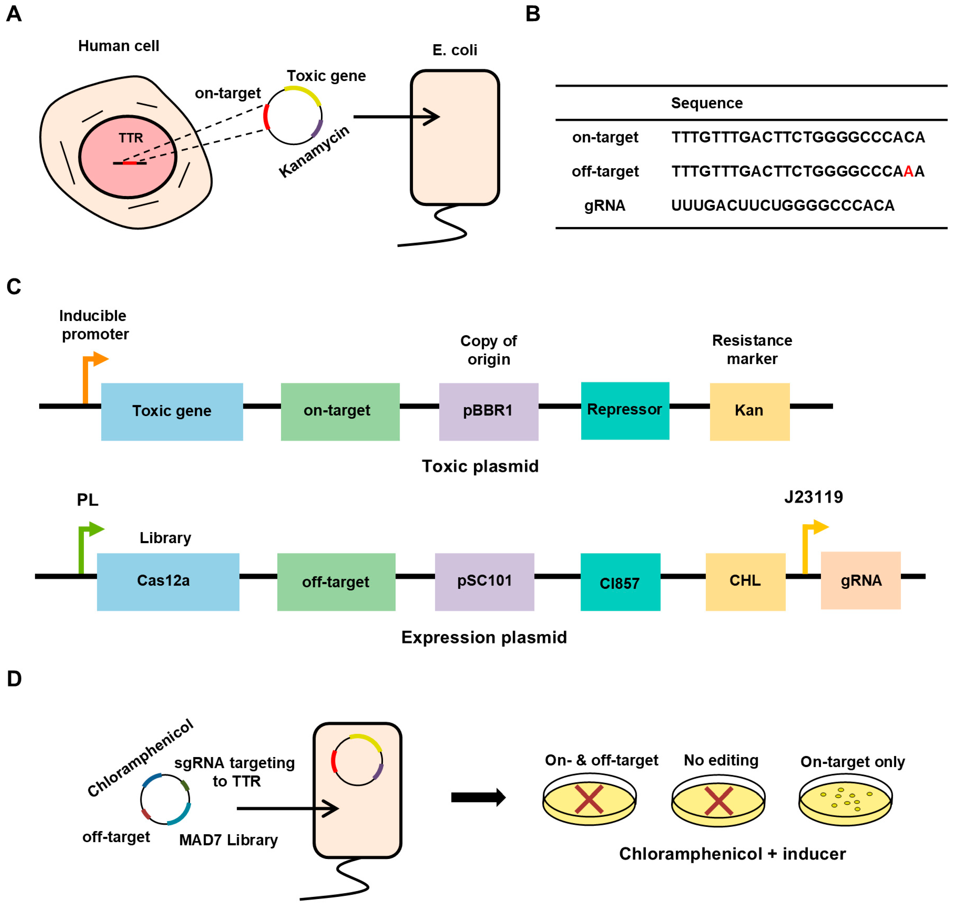 The expression plasmid harbors a MAD7 mutant library, a guide RNA (gRNA) targeting the human TTR locus (sequences: UUUGACUUCUGGGGCCCACA), and a chloramphenicol resistance marker. Expression of MAD7 is regulated by the CI857 repressor under the PL promoter, enabling tight control over their production and the gRNA is expressed from the strong constitutive promoter J23119, ensuring sufficient guide RNA levels to support efficient cleavage. For all strains carrying the expression plasmid, unless a specific incubation temperature was indicated (e.g., 42 °C induction), the cultures were maintained at 30 °C to ensure that cI857 effectively repressed Cas12a expression. An off-target site (TTTGTTTGACTTCTGGGGCCCAAA) differing by a single nucleotide at position 19 from the 5′ end (second-to-last base), corresponding to a distal mismatch. The toxic plasmid carries a toxic gene, along with an on-target site (TTTGTTTGACTTCTGGGGCCCACA) matching
