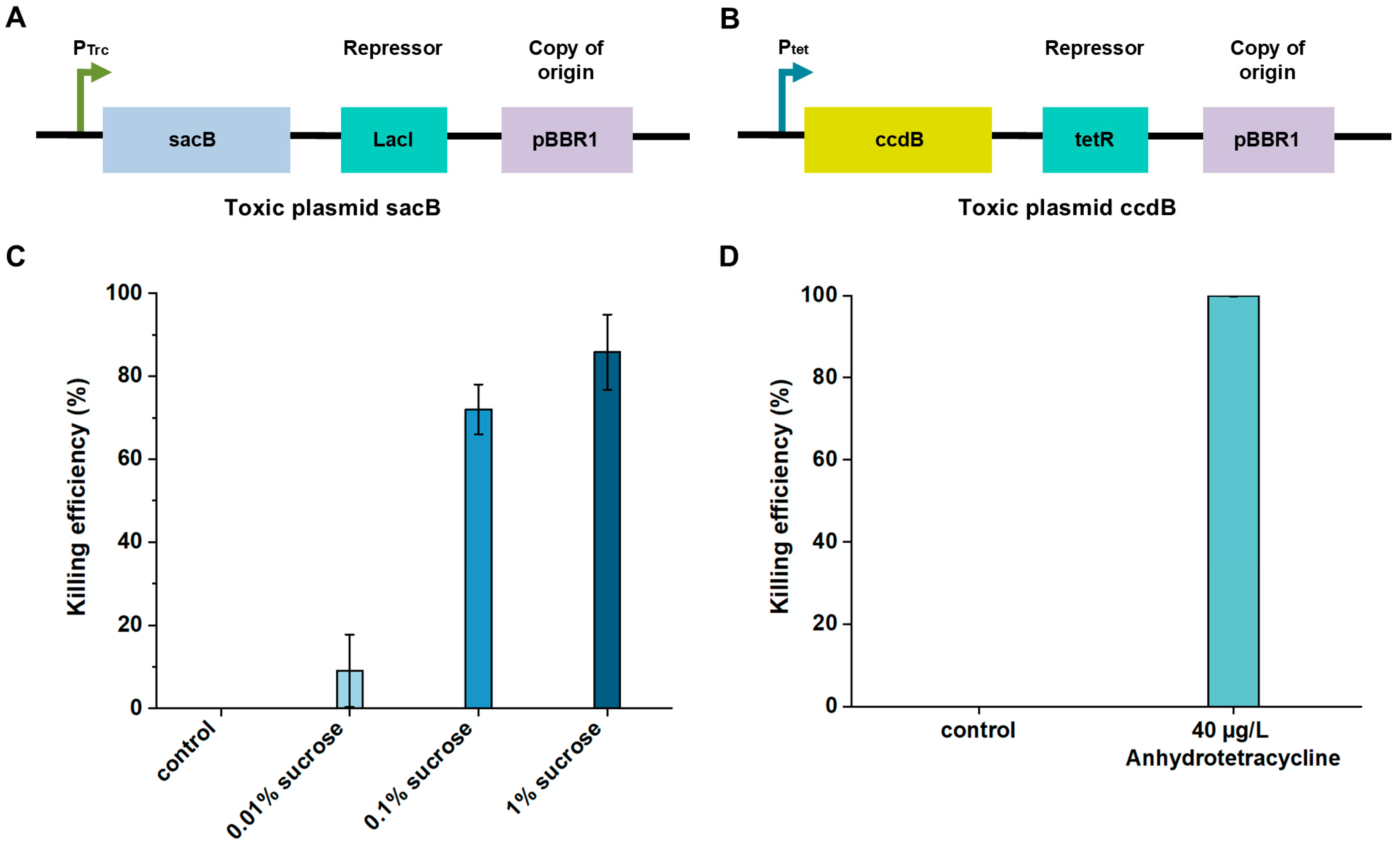 E. coli electrocompetent cells with either the SacB-based or CcdB-based toxic plasmid. After electroporation, cells were incubated at 37 °C with shaking at 200 rpm for 1 h. The recovery cultures were then plated on selective LB agar containing 50 μg/mL kanamycin supplemented with varying concentrations of sucrose (for the SacB system) or 40 µg/L anhydrotetracycline (aTc) (for the CcdB system), as well as on control LB agar containing only 50 μg/mL kanamycin and colony-forming units (CFU) were subsequently counted. The killing efficiency was calculated using the following equation: