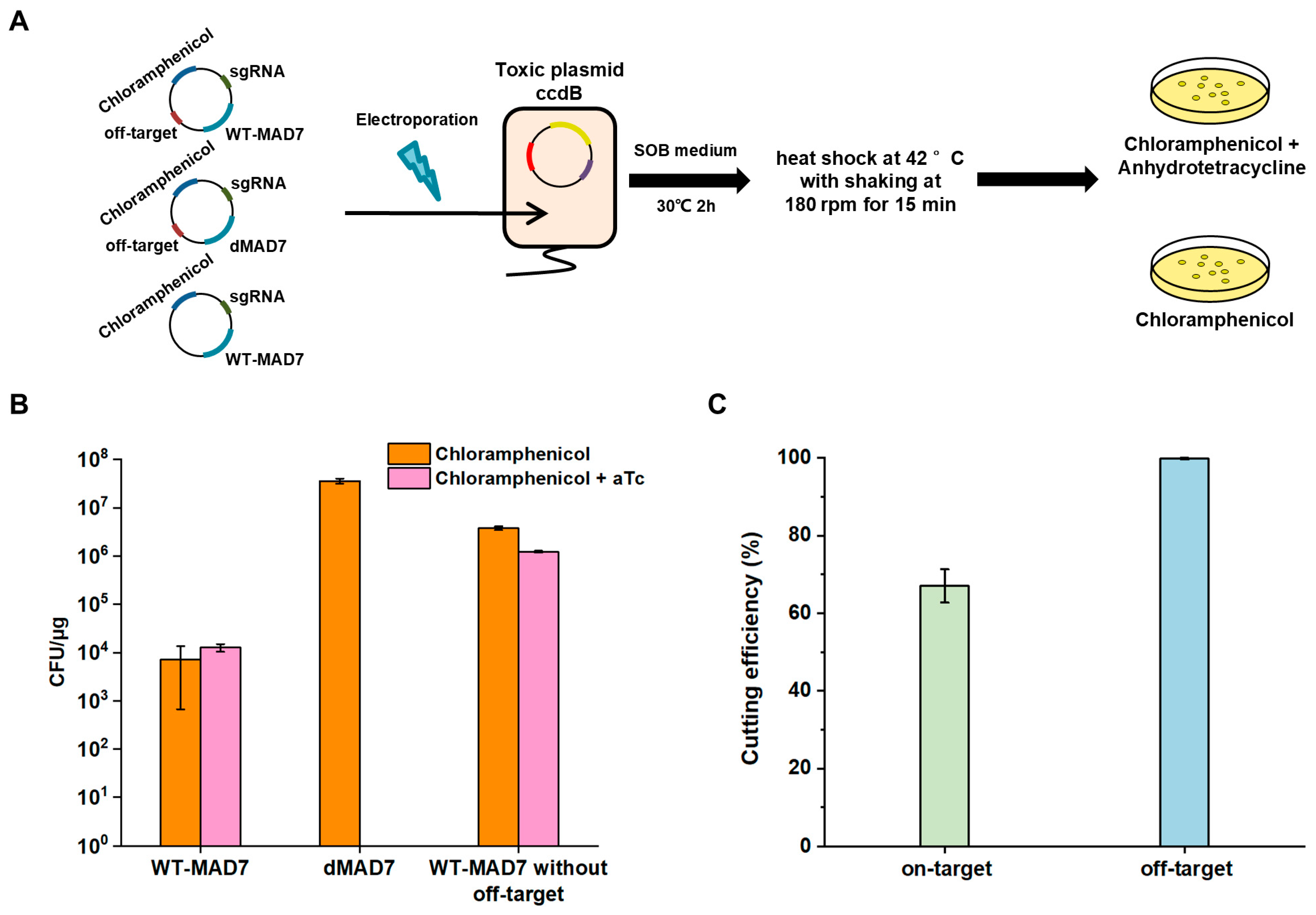 E. coli electrocompetent cells. After electroporation, cells were incubated at 30 °C and 200 rpm for 2 h, followed by incubation at 42 °C and 180 rpm for an additional 15 min to induce MAD7 expression. Cultures were plated on LB agar containing 34 μg/mL chloramphenicol and 40 µg/L anhydrotetracycline for overnight incubation, and CFU were counted. The off-target cleavage efficiency was calculated using the following equation: