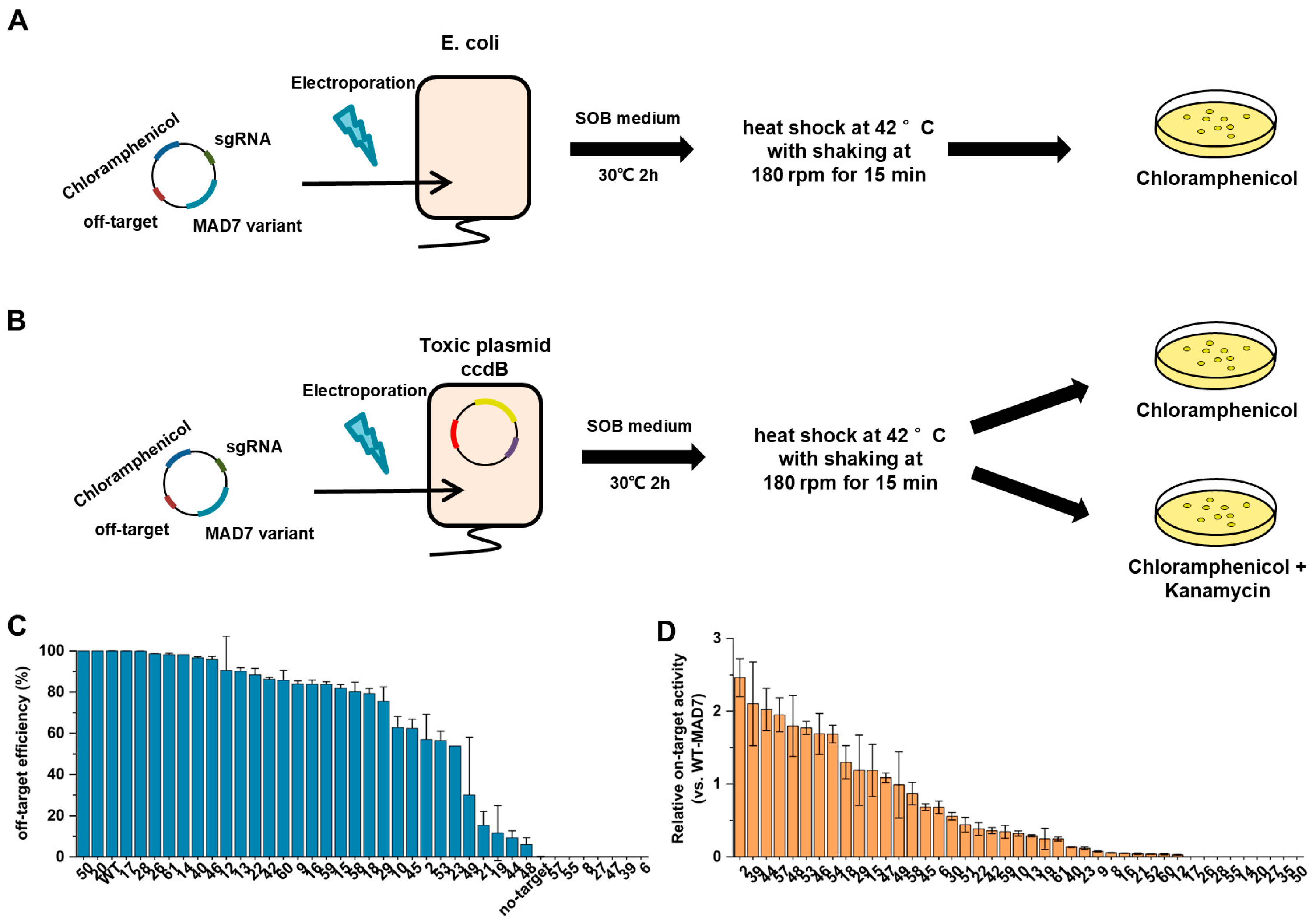 Figure 3C). This high off-target activity resulted in a markedly low survival rate of WT-MAD7 on the selective plates, highlighting the stringent nature of the system. These findings provide a strong rationale for employing the dual-plasmid system to enrich for MAD7 variants with both high fidelity and robust on-target activity.