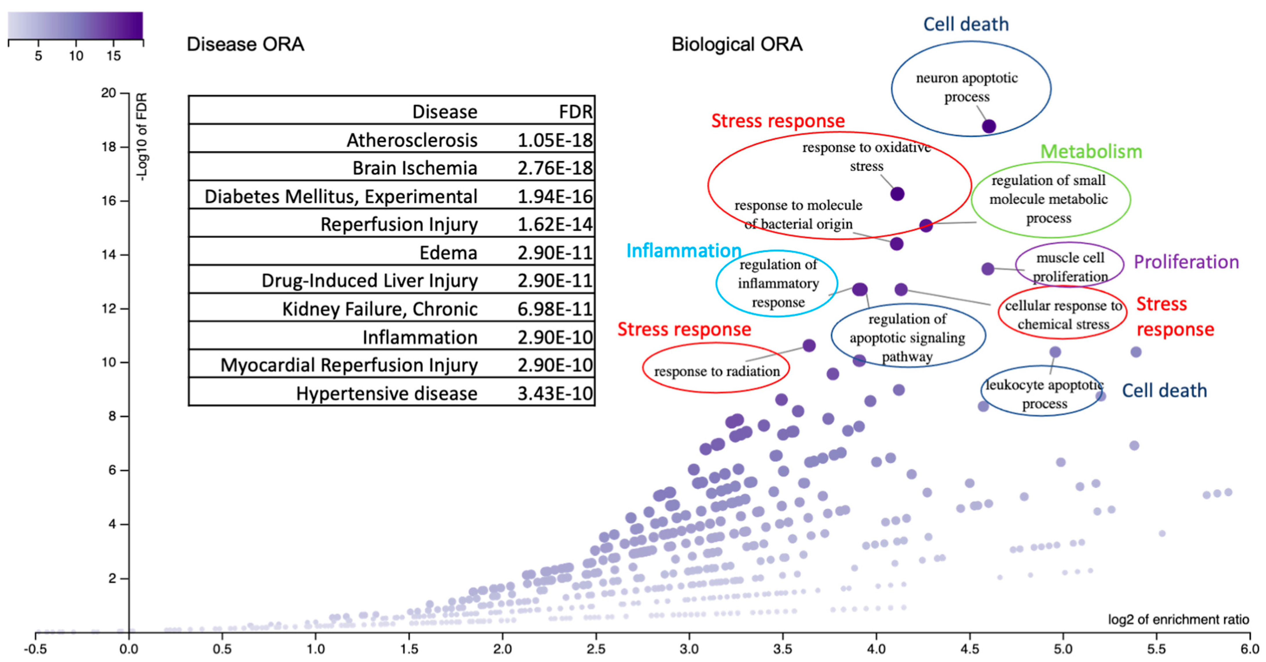 Ischemia | 6 | 30 | 3.90 × 10−8 | ALB, NOS3, CASP3, IL6, TNF, AKT1 |