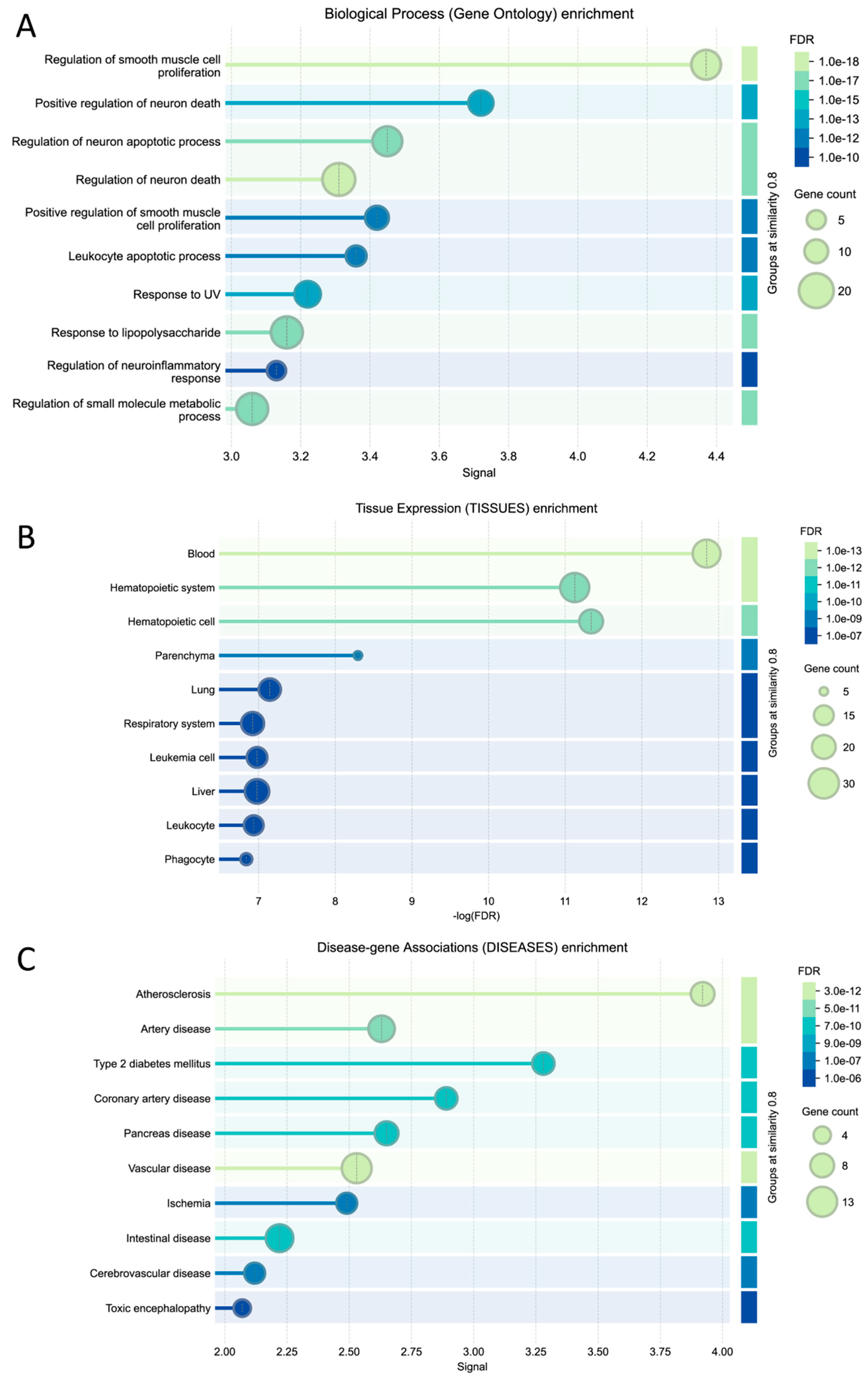 Disease of anatomical entity | 34 | 4798 | 1.58 × 10−11 | GSR, SERPINE1, CCL2, APOB, APOA1, APOE, CYBA, IL1A, TP53, SOD1, IL18, APP, ALB, NOS3, TERT, CASP3, KLK3, CASP9, ITGAL, CASP8, FASLG, MMP9, BCL2L1, IGF1, CDKN1A, IL6, ADIPOQ, TNF, PRNP, AKT1, LDLR, ELANE, FAS, SNCA |