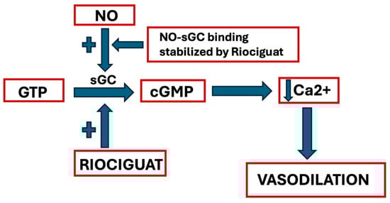 As reported above, NO is synthesized in endothelial cells by the enzyme NO synthase. It activates sGC, which leads to cGMP synthesis. cGMP’s effects include vasodilation, decrease in smooth muscle cell proliferation, and inhibition of platelet aggregation. These effects are mediated by cGMP kinase, which causes an upregulation of potassium (K+) channels and inhibition of calcium (Ca++) channels, thus resulting in a decreased intracellular Ca++ concentration. cGMP also activates myosin light chain phosphatase, which leads to a reduction in myosin phosphorylation and thus to pulmonary vasodilation [84]. Currently, 11 PDE family enzymes have been recognized, and each family differs in terms of substrate affinity, selectivity, or their regulatory mechanism. cGMP is selectively metabolized by PDE-5, PDE-6, and PDE-9 isoforms [85]. The mechanism of action of two classes of drugs—phosphodiesterase 5 inhibitors (PDE5i) and guanylate cyclase stimulators—is based on the pathway reported in Figure 4.