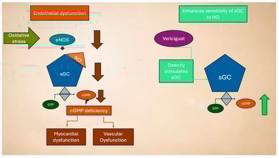 In patients with heart failure and cardiovascular risk factors, reactive oxygen species produced by the endothelium reduce nitric oxide bioavailability. Nitric oxide binds to soluble guanylate cyclase (sGC), thereby stimulating the synthesis of intracellular cyclic guanosine monophosphate (cGMP), a key second messenger involved in the regulation of vascular tone, cardiac contractility, and remodeling [78].
