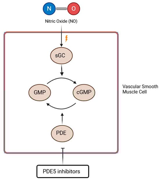 NO is a signaling molecule involved in numerous physiological processes beyond vasodilation. In neuronal cells, NO primarily functions as an atypical neurotransmitter, modulating synaptic plasticity, neuronal transmission, and memory. In this context, NO activates soluble guanylate cyclase (sGC), leading to an increase in intracellular cGMP levels, which serves as a second messenger. cGMP, in turn, regulates ion channels, protein kinases, and PDEs, thereby influencing neurotransmission and cerebral blood flow regulation [14]. However, under conditions of oxidative stress or neurodegeneration, excessive NO production can lead to the formation of reactive nitrogen species (RNSs), contributing to neuronal damage. In the immune system, NO plays a crucial role in inflammatory responses and pathogen defense. Activated macrophages produce NO through the inducible nitric oxide synthase (iNOS) enzyme to eliminate bacteria, viruses, and tumor cells. In this case, NO’s effects are not primarily mediated by cGMP but rather by its ability to interact with proteins and lipids, forming reactive compounds such as peroxynitrite (ONOO−), which damages pathogens [15]. However, uncontrolled NO production can contribute to pathological processes, including chronic inflammation and tissue damage in autoimmune diseases. A schematic view of the NO pathway is provided in Figure 1.