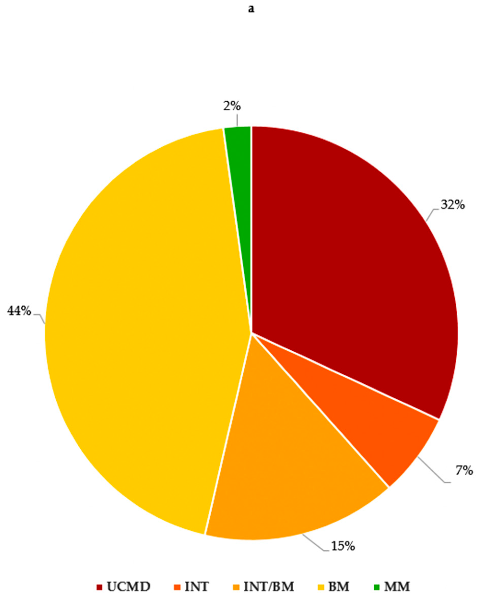- Graziano, A.; Bianco, F.; D’Amico, A.; Moroni, I.; Messina, S.; Bruno, C.; Pegoraro, E.; Mora, M.; Astrea, G.; Magri, F.; et al. Prevalence of congenital muscular dystrophy in Italy: A population study. Neurology 2015, 84, 904–911. [Google Scholar] [CrossRef]