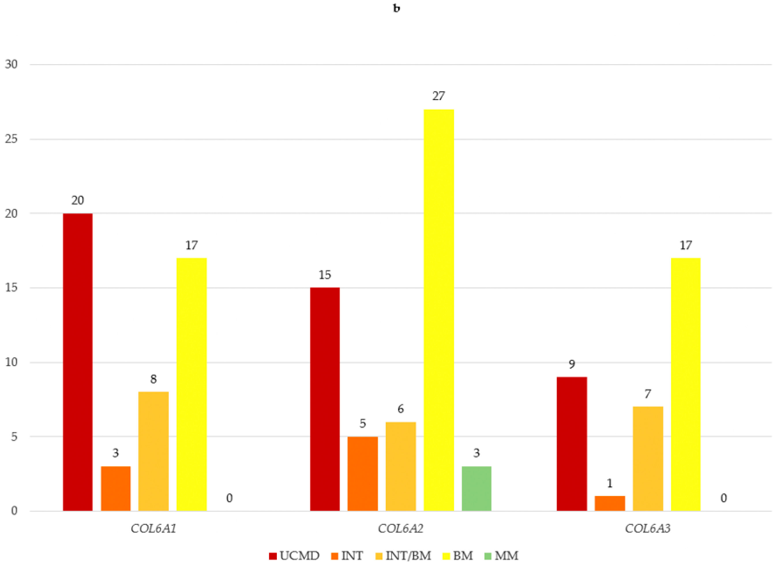 Fortunato, F.; Fiocco, L.; Margutti, A.; Neri, M.; D’Amico, A.; Bertini, E.; Ricci, E.; Mercuri, E.M.; Pane, M.; Massa, R.; et al. Landscape Analysis of COL6A1, COL6A2, and COL6A3 Pathogenic Variants in a Large Italian Cohort Presenting with Collagen VI-Related Myopathies: A Nationwide Report. Biomolecules 2025, 15, 1426. https://doi.org/10.3390/biom15101426