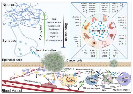 The signal interaction between neurons and epithelial cells, vascular endothelial cells, and immune cells. The figure lists the expression and activation status of key neurotransmitter receptors (including nAChR subtypes α1, α5, α7, α9, mAChR2/3, GABAA, GABAB, D1 and D2 dopamine receptors, β - AR, 5-HT1/2/3/7, mGluR1/2/3) in tumor tissues. These biological functions include epithelial–mesenchymal transition (EMT), angiogenesis, immune escape, proliferation, invasion, migration, chemoresistance, and synaptic plasticity. The green arrow (↑) indicates that receptor activation promotes biological function. The blue arrow (↓) indicates the inhibition of biological function after receptor activation. After neurons release neurotransmitters and act on tumor cells, they affect different cell types (neurons, epithelial cells, endothelial cells, immune cells, and tumor cells) through ligand receptor interactions, forming a microenvironmental signaling network that jointly regulates tumor progression and nervous system function.