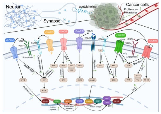 Schematic representation of the crosstalk between neurons and cancer cells mediated by acetylcholine and various signaling pathways. Neurons release acetylcholine that interacts with α7nAChR, α3nAChR, and α5nAChR receptors on the synaptic membrane. These interactions trigger downstream signaling pathways involving VEGFR2, EGFR, TGF-βR, and mAChR2/3, leading to cellular responses such as angiogenesis, chemoresistance, proliferation, and migration. In cancer cells, acetylcholine binding to mAChR3 also influences proliferation and metastasis through PI3K/AKT and NF-κB pathways. The diagram illustrates the complex interplay between neuronal signaling and cancer progression, highlighting potential therapeutic targets for cancer treatment.