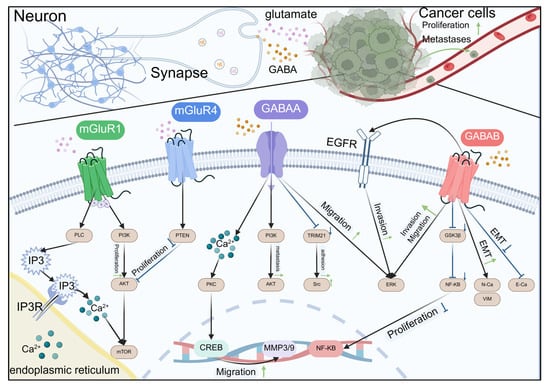Schematic representation of the intricate crosstalk between glutamate and GABA signaling in neurons and their influence on cancer cell behaviors. Neurons release glutamate and GABA that interact with mGluR1, mGluR4, GABAA, and GABAB receptors on the synaptic membrane. These interactions trigger downstream signaling pathways involving PI3K, AKT, PLC, PKC, CREB, GSK3β, NF-κB, and ERK, leading to cellular responses such as proliferation, migration, and invasion. In cancer cells, glutamate binding to mGluR1 and mGluR4 also influences proliferation and migration through PI3K/AKT pathways. GABA binding to GABAA and GABAB receptors modulates cell migration and invasion through PKC and GSK3β pathways, respectively. The diagram illustrates the complex interplay between neuronal signaling and cancer progression, highlighting potential therapeutic targets for cancer treatment.