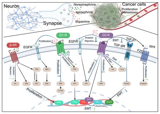 This may be related to dopamine concentration [152,153], receptor subtype [154,155], tumor microenvironment [156,157,158], tumor type, and activated signaling pathways [157].