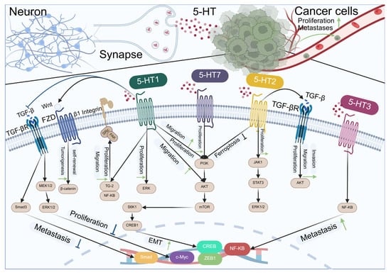Schematic representation of the interactions between serotonin receptors (5-HT1 to 5-HT7) and their downstream signaling pathways in neurons and cancer cells. In neurons (left side), the activation of 5-HT1 receptors leads to the inhibition of proliferation and metastasis through the Wnt/β-catenin pathway, while 5-HT2 receptors promote proliferation via the ERK pathway. In cancer cells (right side), 5-HT2 and 5-HT3 receptors enhance proliferation and metastasis through the PI3K/AKT/mTOR pathway. Additionally, 5-HT7 receptors promote proliferation and migration in cancer cells via the JAK1/STAT3 pathway. The diagram also illustrates the role of 5-HT receptors in ferroptosis inhibition and the epithelial–mesenchymal transition (EMT) process, which is associated with metastasis. Key signaling molecules and pathways are indicated, including TGF-β, FZD, β1 Integrin, MEK1/2, ERK1/2, PI3K, AKT, mTOR, JAK1, STAT3, NF-κB, and the transcription factors CREB, CREB1, c-Myc, and ZEB1.