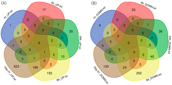 Venn diagrams of the numbers of genes upregulated or downregulated in the CAGE analysis: (A) upregulated genes and (B) downregulated genes.
