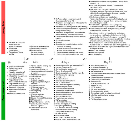 Data for significantly upregulated or downregulated genes were extracted at every RNA sampling point. The extracted genes were functionally classified according to biological processes (BPs) in GO. The statistically significant GO terms were extracted in each group of differentially expressed genes using the Benjamini–Hochberg method (Tables S1 and S2). To determine the hierarchical structure of the extracted GO terms, QuickGO, an online analysis tool, was used. GO terms in red in the table show the GO terms and false discovery rate (FDR)-corrected p-values at the bottom of the hierarchical tree output created using the Explore Biology feature in QuickGO. Among the red GO terms in Tables S1 and S2, similar GO terms for each time point were classified and summarized in chronological order (Figure 4).