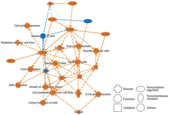 According to the CAGE analysis results for each PFOA treatment time, the QIAGEN Ingenuity Pathway Analysis software package (version Spring 2023.I, QIAGEN, Redwood City, CA, USA) was used to analyze genes whose expression significantly changed (FDR < 0.05) in the PFOA treatment group compared with the solvent control group. The values of the log2 fold change in the PFOA-treated group relative to the solvent control group and the gene names were also analyzed using this software.