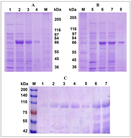 The electrophoretic analysis of heterologous expression of the recombinant laccases from P. roridum VKM F-3565 in E. coli BL21(DE3) cells ((A,B) 8% SDS-PAGE gel) and K. phaffii GS115 ((C) 7% SDS-PAGE gel) cells. (A,B) Crude extract of E. coli BL21(DE3) cells (induction by 1 mM IPTG): (1) before induction, (2) after induction (total protein), (3) soluble protein fraction after induction, (4) insoluble protein fraction after induction, (M) marker proteins (kDa), (5) before induction in the presence of additional 0.25 mM CuSO4, (6) after induction in the presence of 0.25 mM CuSO4 (total protein), (7) soluble protein fraction after induction in the presence of 0.25 mM CuSO4, and (8) insoluble protein fraction after induction in the presence of 0.25 mM CuSO4. (C) The culture liquid of K. phaffii GS115 cells during heterologous expression: (M) marker proteins (kDa), (1–7) days of cultivation (addition of methanol at final concentration of 0.5% each day).
