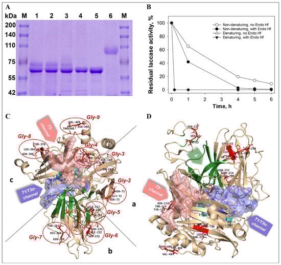 Influence of N-deglycosylation on the molecular mass (A) and the activity (B) of the recombinant laccase from P. roridum VKM F-3565 (the conditions were used according to the manufacturer’s instruction for Endo Hf Kit (NEB)) as well as distribution of the predicted N-glycosylation sites on the surface of the laccase molecule of P. roridum VKM F-3565. (C) Top view. (D) Side view. A (SDS-PAGE electrophoresis, 7% gel): (M) marker proteins, (1) denaturing conditions after 1 h of incubation, (2) denaturing conditions after 6 h of incubation, (3) non-denaturing conditions after 1 h of incubation, (4) non-denaturing conditions after 6 h of incubation, (5) endoglycosidase Hf, and (6) the recombinant laccase from P. roridum VKM F-3565. The laccase domains are marked as a, b, and c.