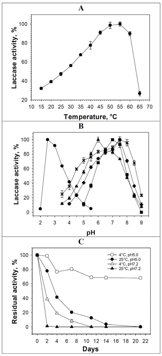 Properties of the recombinant laccase from P. roridum VKM F-3565: (A) temperature optimum; (B) pH optimum in the reaction with different substrates (ABTS (circle symbols), syringaldazine (triangle), 2,6-dimethoxyphenol (square), coniferyl alcohol (diamond), and ferulic acid (x)); and (C) stability of the enzyme at different temperatures and pH.
