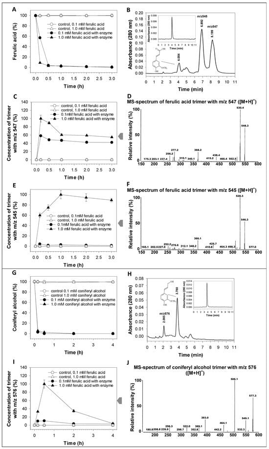 Dynamics of ferulic acid (A–F) and coniferyl alcohol (G–J) transformation and corresponding products formation catalyzed by the recombinant laccase from P. roridum VKM F-3565 under neutral conditions. The average values are given based on the results of at least three replicates with an error of <5%. Chromatograms of the reaction mixtures containing ferulic acid (B) or coniferyl alcohol (H) as substrates and the recombinant laccase as catalyst are shown as examples. The chromatograms of the standard compounds (10−5 M), used in the experiment as the initial substrates, are shown as insertions (trans-ferulic acid (128708-5G, Sigma-Aldrich, St. Louis, MO, USA) and coniferyl alcohol (223735-100 mg, Sigma-Aldrich, St. Louis, MO, USA)).
