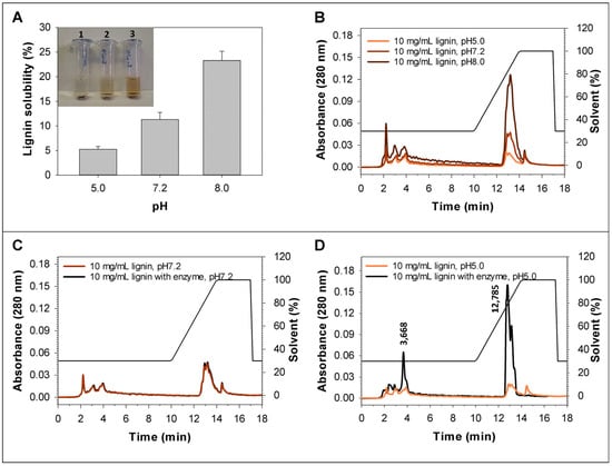 Solubility of 10 mg/mL birch lignin in buffers with different pH levels (pH 5.0 is 20 mM Na-acetic buffer, pH 7.2 and pH 8.0 are 50 mM Tris-HCl buffer) and the lignin degradation by the recombinant laccase from P. roridum VKM F-3565 under neutral and acid conditions. (A) The changes in the color of the lignin solutions after 24 h of incubation (at pH 5.0 (1), pH 7.2 (2), and pH 8.0 (3)) and the quantitative analysis of lignin solubility based on the determination of the difference in mass between the initial dry lignin and undissolved dried lignin after 24 h incubation in an appropriate buffer. (B) The chromatogram of the dissolved birch lignin after 24 h of incubation in buffers with different pH. (C,D) The chromatograms of the reaction mixtures of the dissolved birch lignin without and with the recombinant laccase after 24 h of incubation under neutral and acid conditions, correspondingly.