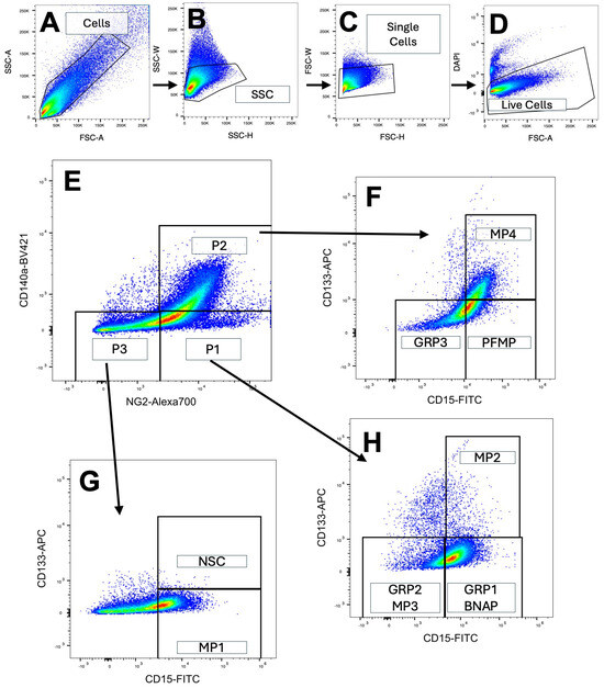 Cells from the mouse P5 periventricular zone were dissociated using Liberase and manual trituration. This approach preserves surface antigens that are removed using other enzymes [25,35]. The cells were stained for CD133/Prominin1, CD15/Lex/heat-stable antigen, CD140a/PDGFRα, and NG2/Chondroitin Sulfate and FACS-sorted according to antigenic profiles into five unique populations as described below. Single cells were identified using forward vs. side-scatter to exclude debris and doublets, as shown in Figure 1A–C. Dead cells were excluded using DAPI staining (Figure 1D). Live cells were then gated first according to CD140a and NG2 expression (Figure 1E) followed by a secondary gate of CD133 and CD15 (Figure 1F–H). Neural Stem cells (NSCs), BNAP/GRP1s, GRP2/MP3s, GRP3s, and PFMPs were sorted according to antigen expression as described previously [28,30] and collected in lysis buffer for RNA extraction and further analysis.