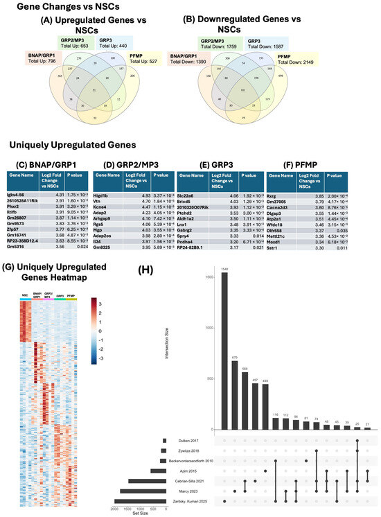 Each NP population expressed, on average, 235 (100–366) uniquely upregulated genes compared to NSCs (Figure 2A). The top three upregulated genes in each population were Igkv4-56 (fold change vs. NSCs of 19.8), Cryba4 (fold change vs. NSCs 19.2), and Gpr34 (fold change vs. NSCs 18.7) for BNAP/GRP1; Gpr34 (fold change vs. NSCs of 35.8), Gm29291 (fold change vs. NSCs 32.2), and Higd1b (fold change vs. NSCs 30.5) for GRP2/MP3; Lhfpl3 (fold change vs. NSCs of 72.3), Dmrtb1 (fold change vs. NSCs 45.9), and Matn4 (fold change vs. NSCs 42.0) for GRP3; and Matn4 (fold change vs. NSCs of 49.8), Tmem255b (fold change vs. NSCs 49.4), and Brinp3 (fold change vs. NSCs 46.7) for PFMPs (Figure 2C–F).