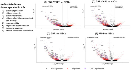 Volcano plots of each cell type vs. NSCs (Figure 3B–E for BNAP/GRP1, GRP2/MP3, GRP3, and PFMP, respectively) with cilia-related genes highlighted in purple clearly show that these genes are overrepresented in the downregulated genes in all four progenitor subtypes and make up some of the most statistically significant and high-magnitude downregulated genes. The genes with the largest change in this group were Ccdc113 (829.1-fold downregulation in BNAP/GRP1 compared to NSC, 372.9× in GRP2/MP3, 1041.7× in GRP3, and 661.1× in PFMP); Foxj1 (163.0x in BNAP/GRP1, 162.4× in GRP2/MP3, 141.4× in GRP3, and 620.5× in PFMP); and Tekt4 (54.3× in BNAP/GRP1, 315.7× in GRP2/MP3, 82.2× in GRP3, and 614.3× in PFMP).