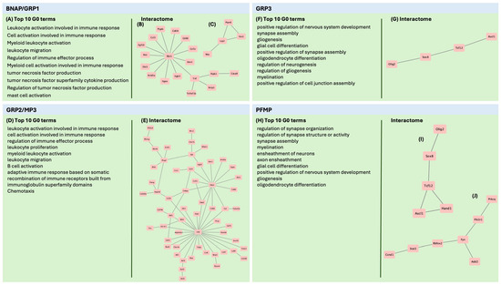 Protein–protein interactions of upregulated genes in each cell population. Genes upregulated in each population compared to neural stem cells were analyzed using Overrepresentation Analysis and compared against Gene Ontology terms. The top 10 upregulated gene ontology terms are displayed for each cell population: (A) BNAP/GRP1; (D) GRP2; (F) GRP3; (H) PFMP. Upregulated genes in each NP population compared to NSCs were analyzed using NetworkAnalyst and the IMEx Interactome. Zero-order networks with >3 genes are displayed for each NP subtype (B,C) BNAP/GRP1; (E) GRP2; (G) GRP3; (I,J) PFMP).