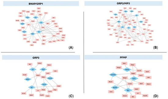 Transcription factors controlling differentiation of unique neural progenitor cell populations. Upregulated genes in each NP population compared to NSCs were analyzed using NetworkAnalyst and the TRRUST database to generate predicted gene-transcription factor interactions which were analyzed using Cytoscape 3.10.3. Predicted transcription factors (blue) were included if BetweenessCentrality was > 0.05. Networks are displayed for: (A) BNAP/GRP1; (B) GRP2; (C) GRP3; and (D) PFMP with upregulated genes (red) and predicted transcription factors (blue).