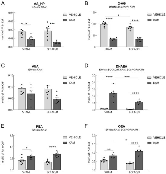 High-performance liquid chromatography (HPLC) and HPLC-mass spectrometry (HPLC-MS) were used to analyze the frontal cortex (CFX) of four experimental groups, SHAM-vehicle, SHAM-Kaempferol (KAM), bilateral common carotid artery occlusion followed by reperfusion (BCCAO/R)-vehicle, and BCCAO/R-KAM rats. (A) AA_HP, arachidonic acid hydroperoxides; (B) 2-AG, 2-arachidonoylglycerol; (C) arachidonoylethanolamide (AEA); (D) docosahexaenoylethanolamide (DHAEA); (E) palmitoylethanolamide (PEA); (F) oleoylethanolamide (OEA) concentrations, expressed as mol% of total fatty acid (FA). Results are presented as mean values (bars) and superimposed individual data points for vehicle- (n = 7 for both SHAM-vehicle and BCCAO/R-vehicle) (●) and KAM-treated (n = 7 for both SHAM-KAM and BCCAO/R-KAM) (▲) groups. Error bars represent the standard error of the mean (S.E.M.). Significance levels are indicated as follows: * p < 0.05; ** p < 0.005; *** p < 0.001; **** p < 0.0001. Refer to Table S1 for F- and p-values related to the effects of BCCAO/R and KAM pre-treatment, as well as their interaction.