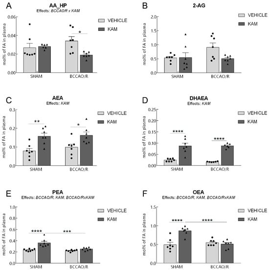 High-performance liquid chromatography (HPLC) and HPLC-mass spectrometry (HPLC-MS) were used to analyze the plasma of four experimental groups, SHAM-vehicle, SHAM-kaempferol (KAM), bilateral common carotid artery occlusion followed by reperfusion (BCCAO/R)-vehicle, and BCCAO/R-KAM rats. (A) AA_HP, arachidonic acid hydroperoxides; (B) 2-AG, 2-arachidonoylglycerol; (C) arachidonoylethanolamide (AEA); (D) docosahexaenoylethanolamide (DHAEA); (E) palmitoylethanolamide (PEA); (F) oleoylethanolamide (OEA) concentrations, expressed as mol% of total fatty acids (FA). Results are presented as mean values (bars) and superimposed individual data points for vehicle- (n = 7 for both SHAM-vehicle and BCCAO/R-vehicle)(●) and KAM-treated (n = 7 for both SHAM-KAM and BCCAO/R-KAM) (▲) rats. Error bars represent the standard error of the mean (S.E.M.). Significance levels are indicated as follows: * p < 0.05; ** p < 0.005; *** p < 0.001; **** p < 0.0001. Refer to Table S1 for F- and p-values related to the effects of BCCAO/R and KAM pre-treatment, as well as their interactions.