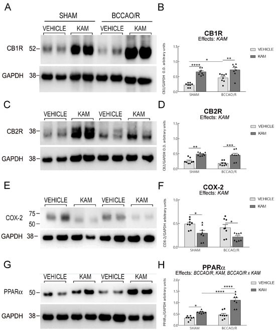 Tissue homogenates were prepared from eight rats per group (SHAM-vehicle, BCCAO/R-vehicle, SHAM-KAM, BCCAO/R-KAM) in 2% sodium dodecyl sulfate (SDS) with protease inhibitors (cOmplete, Mini Protease Inhibitor Cocktail Tablets, Roche, Basel, Switzerland). Protein concentrations were measured using the Lowry protein assay []. For each sample, 40 μg of protein was separated by SDS-polyacrylamide gel electrophoresis (SDS-PAGE) (NuPAGE 4–12% Bis-Tris Gel Midi, Life Technologies, Waltham, MA USA) and transferred to a PVDF membrane (Amersham HybondTM-P, GE Healthcare, Little Chalfont, UK). Membranes were blocked in TBS-T containing 5% milk and incubated overnight at 4 °C with the following rabbit polyclonal antisera: CB1R (Cat#258003, Synaptic System, Göttingen, Germany; 1:500), CB2R (Cat#101550 Cayman Chemical, Ann Arbor, Mi, USA; 1:1000), COX-2 (residues 570–598; Cat#160106, Cayman Chemical Ann Arbor, Mi, USA; 1:200), PPARα (Cat#PA1-822A, Thermo Scientific, Waltham, MA, USA; 1:1000), GFAP (Cat#Z0334, Dako, Glostrup, Denmark; 1:4000), and Iba1 (Cat#019-19741, Waco Pure Chemical Industries, Ltd., Osaka, Japan; 1:1000). After rinsing, blots were incubated with peroxidase-conjugated goat anti-rabbit serum (Sigma Aldrich; 1:10,000). Glyceraldehyde 3-phosphate dehydrogenase (GAPDH) (mouse monoclonal, Cat#MAB374, EMD Millipore, Darmstadt, Germany; 1:1000) was used as a loading control with a peroxidase-conjugated goat anti-mouse secondary antiserum (EMD Millipore, Darmstadt, Germany; 1:5000) as a secondary antiserum. To assess non-specific staining, blots were stripped and incubated with the secondary antiserum only. Protein bands were visualized using the ECL and an ImageQuant LAS 4000. Ratios of target proteins to GAPDH were calculated and O.D. values quantified with Li-Cor Image Studio Lite Software (LICORbio GmbH, Bad Homburg, Germany).