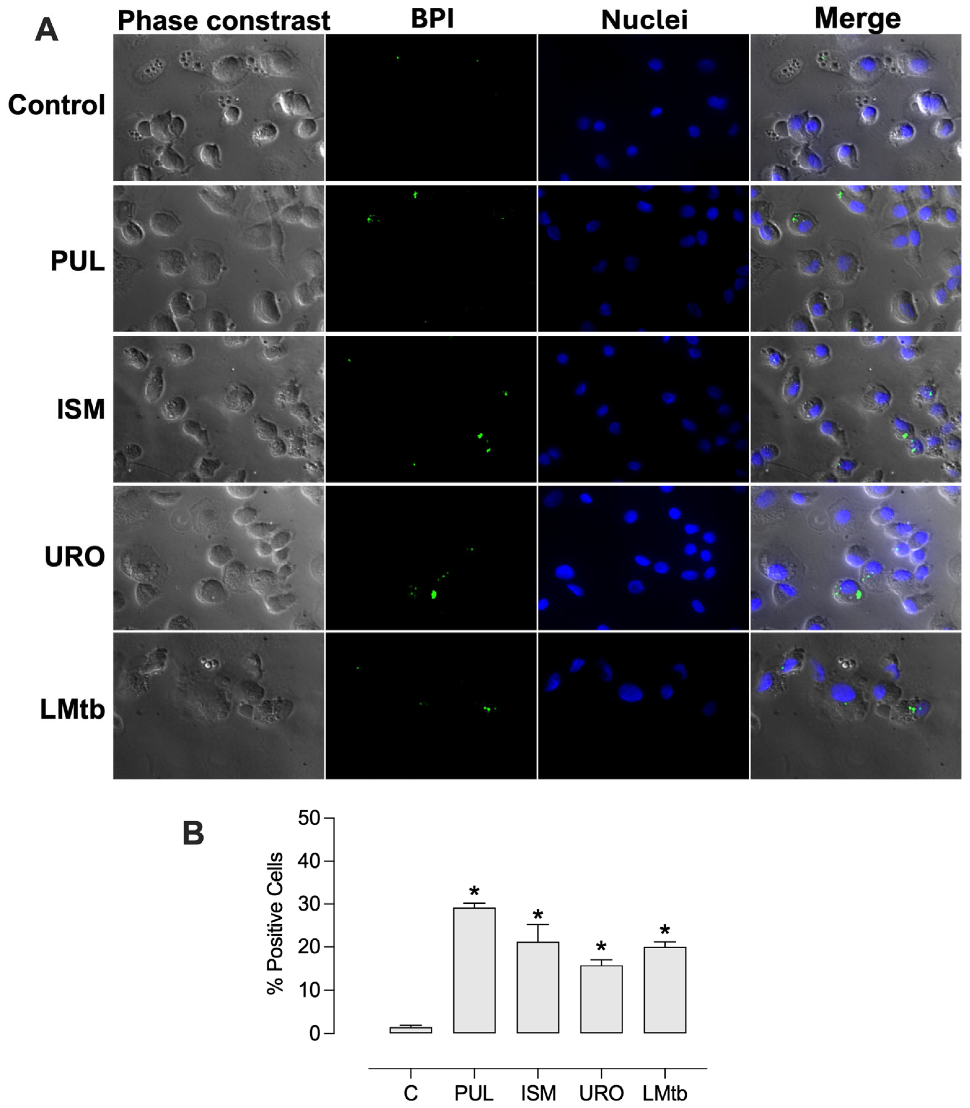 M. tuberculosis maintained high BPI expression, with values of 34 ± 2.9%, 31 ± 3.1%, 14 ± 1.5% and 23 ± 2.7%, for Pulmonarom, Ismigen, Uro-Vaxom, and LMtb, respectively (