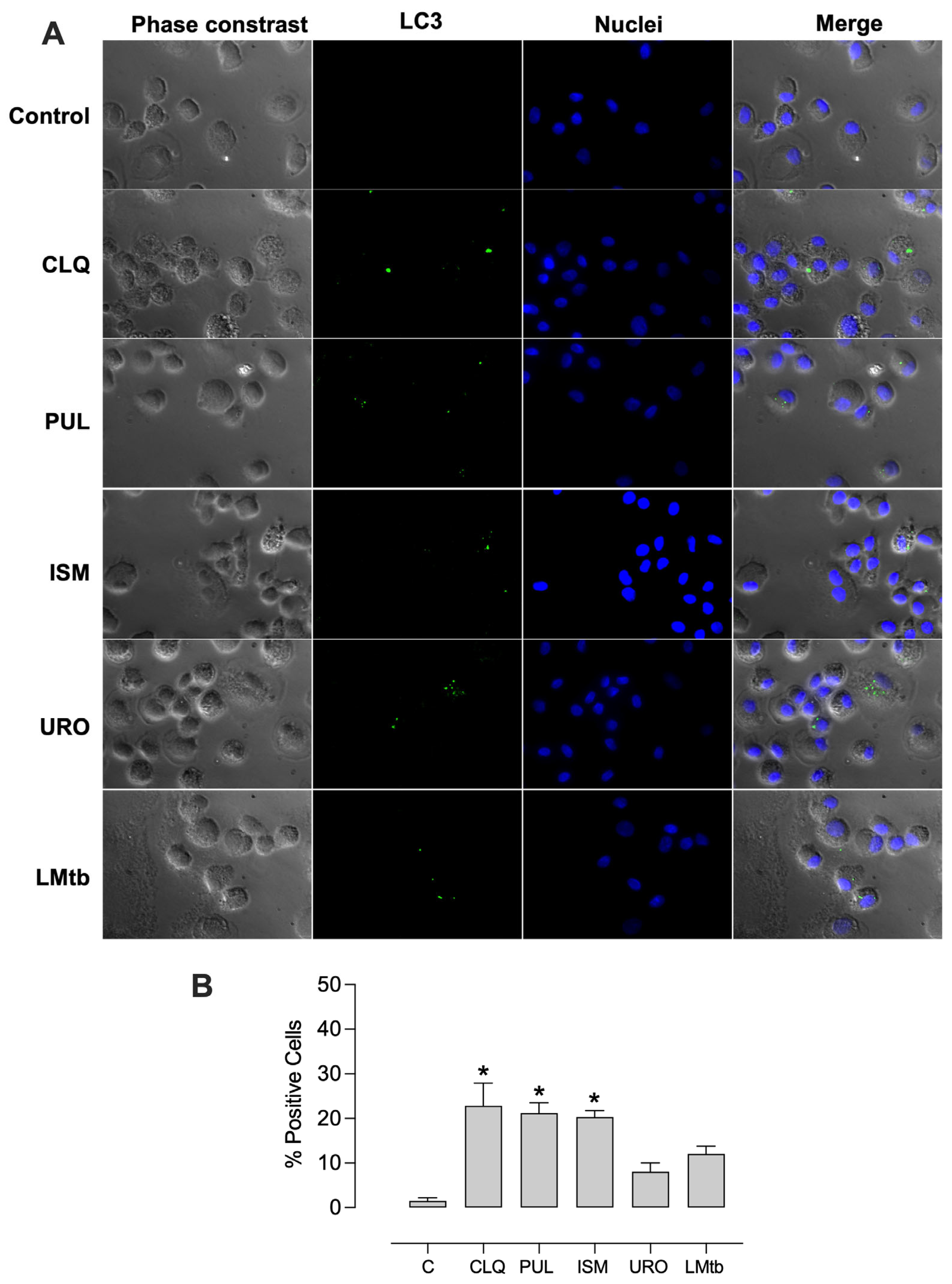 Macrophages were seeded in a Lab-Tek II chamber and then treated and infected as described above, and incubated for 24 h. Cells were stained with rabbit anti-LC3B conjugate with Alexa Fluor 488 (Novus Biologicals, CO, USA) as a marker of autophagosome and counterstained with Hoechst to detect nuclei. Cells were visualized using an AxioScope.A1 fluorescence microscope.