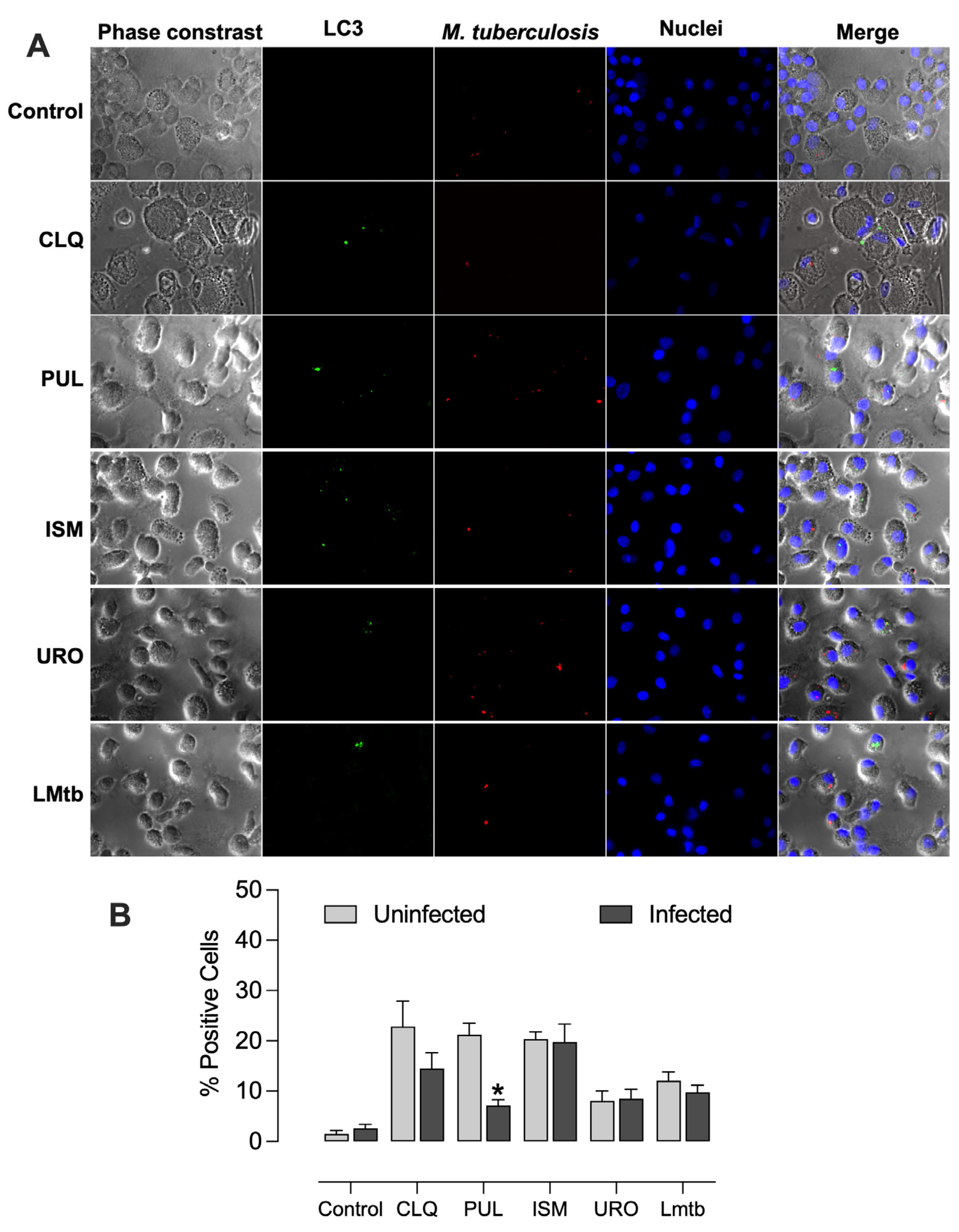 M. tuberculosis, autophagy levels remained largely sustained under lysate treatment, except for Pulmonarom, which was associated with a significant reduction in autophagosome formation. Such a decrease is consistent with the action of