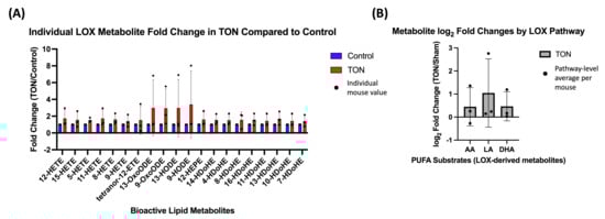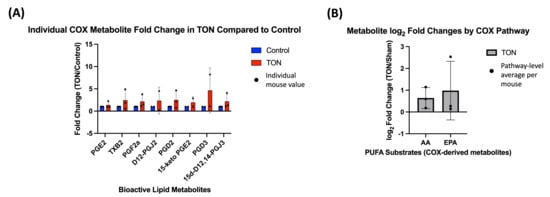 Compared to the LOX and CYP pathways, relatively few COX-derived bioactive lipids were detected. No statistically significant difference was observed in individual COX metabolites (Figure 4A) or in pathway-level comparisons of AA- and EPA-derived subgroups (Figure 4B). However, all metabolites showed log2 FC above 0, suggesting a potential upward trend in COX activity following TON. Complete log2 FC values for individual metabolites and their pathway-averaged groupings are provided in Supplementary Table S2.