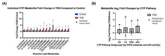 CYP-derived metabolites were similarly analyzed both individually and by PUFA substrate grouping. Individual fold changes for all detected CYP metabolites are shown in Figure 3A, and pathway-level log2 FC grouped by PUFA origin (AA, LA, DHA) are shown in Figure 3B. In addition, a subgroup of downstream metabolites generated via soluble epoxide hydrolase (sEH), an enzyme that acts on CYP-derived epoxides, was analyzed separately to evaluate secondary processing within the CYP pathway.