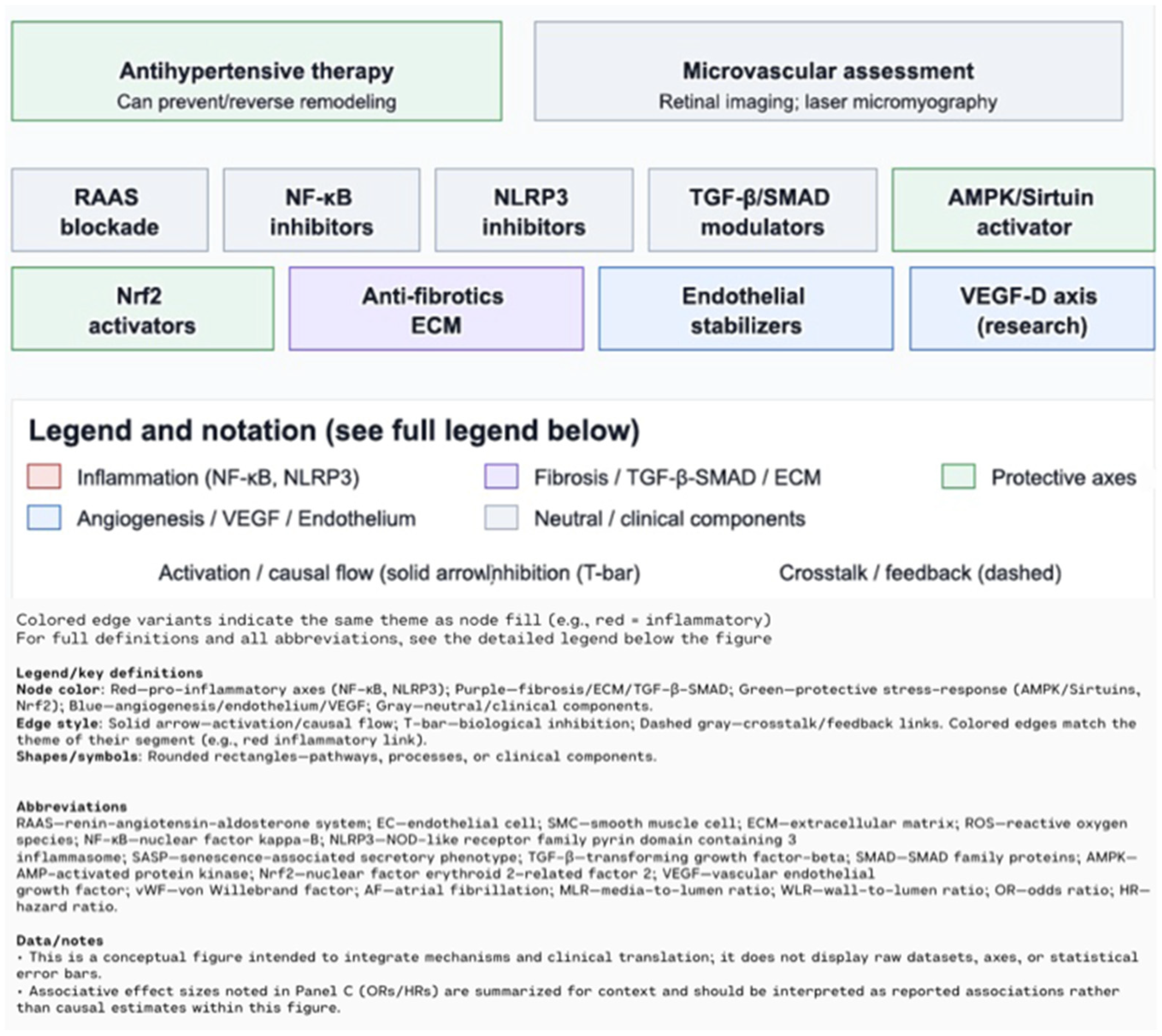 DDR activation, ER stress, mitochondrial dysfunction, elevated ROS levels contractile abnormalities, epigenetic dysregulation (miRNAs), promotes fibroblast activation: inflammation, fibrosis, hypertrophy. | Central role in ECM remodeling; senescent by p53/p-21, drive paracrine hypertrophy, fibrosis. | NO, EDHF, mitochondrial dysfunction, RAAS activation, oxidative stress, impaired angiogenesis, promote vascular inflammation. | Telomere attrition, DNA damage, oxidative stress, defective autophagy; induce immune recruitment, matrix degradation, osteogenic shift: vascular stiffening, calcification. | Respond to SASP signals, further shaping inflammation, senescence propagation, or clearance. | |