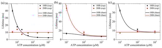 Lifetimes of 1HB and 2HB states of kinesin motor in a stepping cycle versus ATP concentration. (a) The experimental results (symbols) are from Isojima et al. []. The theoretical results (lines) are from Refs. [,]. (b) The experimental results (symbols) are from Mickolajczyk et al. []. The theoretical results (lines) are from Ref. []. (c) The experimental results (symbols) are from Wolff et al. []. The theoretical results (lines) are from Ref. [].