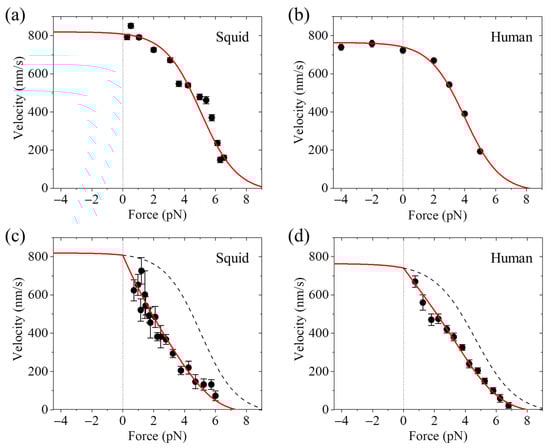 In short, using the movable optical trap, it was determined that the relation between the velocity and backward load generally has a sigmoid form [,,,], as shown in Figure 2a,b. In contrast, using the fixed optical trap, it was determined that the relation between the velocity and backward load generally has a nearly linear form [,,,,,], as shown in Figure 2c,d.